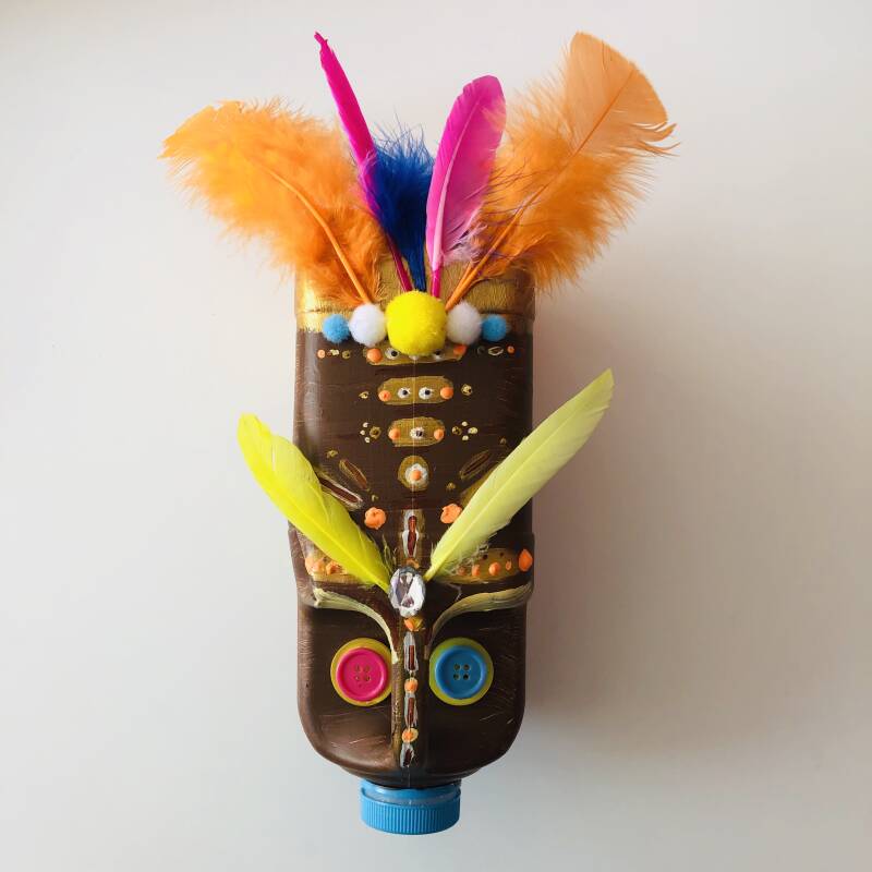 Jullie gaan met een oude fles een Afrikaans masker maken. Het leukste is dat om te doen in vooral aardetinten, met eventueel kleurrijke accenten.