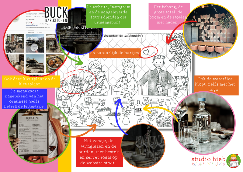 Tot slot heb ik het logo, de website en de socials op de kleurplaat gezet met het juiste lettertype. BUCK heeft nu een kleurplaat die uniek is en helemaal eigen. Hoe gaaf! Nu maar hopen dat de kleine klantjes maar heel veel mogen komen kleuren.