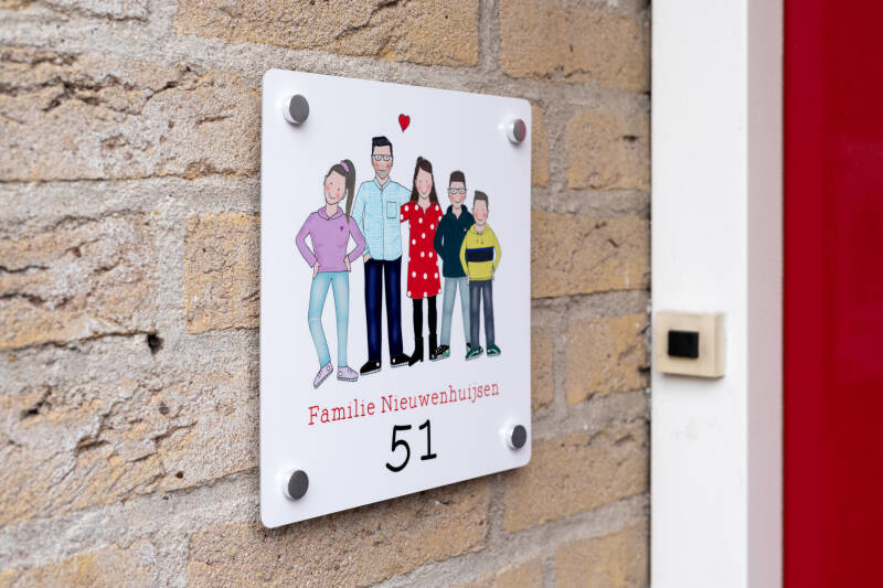Wil je de familietekening niet in je huis maar juist als blikvanger naast de voordeur? Ik lever de illustratie dan aan als naambordje inclusief naam en/of huisnummer. Dat valt op! De leukste deur van de straat; niemand heeft zo’n persoonlijk en kleurrijke entree als jij. Studio Bieb heeft nu een extra optie: een aluminium naambordje.